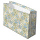 Elegante und schicke blaue Iris mit hellgrünen Blätter auf cremefarbenem Hintergrund mit subtilen Farnmustern. Das Muster ist nahtlos und kann nach oben oder unten skaliert werden.