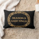 Ein festliches Lumbalkissen oder Kissen mit einem Weihnachtskranz aus Heiligem, Efeu, Poinsettias, Tannenzapfen und Tannenbaum. Dieser handgezeichnet Weihnachtskranz wirkt auf schwarzem Hintergrund goldfarben, mit "Season's Greetings" in dekorativer Schrift, auch in Goldeffekt.