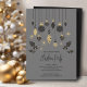 Schwarze und goldene Weihnachtsbaumschmuck, Heilige und Beeren auf grauem Hintergrund unterstreichen diese Feier-Einladungen mit Ihren Details in schicken Schriften. Ideal für Ihre privaten oder geschäftlichen Feierlichkeiten. Bestellen Sie INSTANT DOWNLOAD und/oder DRUCKTE Party Einladungen.