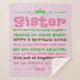 Schwester, wir sind so viel Lachen geteilt, so viele Tränen geteilt. Wir sind eine spirituelle Bindung, die jedes Jahr stärker wird. Wir sind Schwestern von Geburt an, aber wir wussten von Anfang an Bescheid. Gott brachte uns auch zusammen, um auswendig Schwestern zu sein. Sie werden diese bezaubernde rosa, grüne und braune Typografie Liebe.