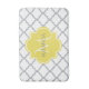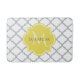 Ein elegantes, weißes und graues marokkanisches Vierblattmuster-Bade mit einem gelben Abzeichen, das Sie personalisieren können, indem Sie Ihren Namen und Monogramm zuerst hinzufügen. Dies ist Teil der Coconut Milk und Meadowlark Spring Quatrefoliensammlung. Wählen Sie aus 3 Größen.