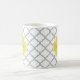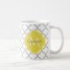 Eine schicke, weiße und graue marokkanische Vierblattmuster-Tasse mit einem gelben Abzeichen können Sie personalisieren, indem Sie Ihren Namen und Monogramm zuerst hinzufügen. Dies ist Teil der Coconut Milk und Meadowlark Spring Quatrefoliensammlung.