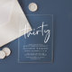 Mit dieser klaren Acryleinladung, die "dreißig" in einem schick-weißen Drehbuch, Ihren Namen in eleganter weißer Serifentypografie und die Party-Details in einfacher, moderner Schrift, einem Party aus dem 30.