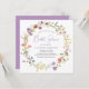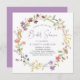 Eine elegante Brautduscheinladung mit "Brautparty" in einem schicken Lavendel-lila Drehbuch und einem boho-inspiriert Kranz lila, rosa, pfirsichfarbener und gelber Wildblume Wasserfarben. Personalisieren Sie den Namen der Braut und die Duschdetails in einfachen Lavendel und graue Schrift.