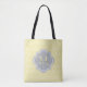Eine schicke, gelbe Deko-Skallop-Muster Tote-Tasche mit einem weichen grauen Quarrefolien-Abzeichen können Sie personalisieren, indem Sie einfach Ihre eigenen Monogramm und Namen. Dies ist Teil der Meadowlark Scallops Harbor Mist Monogram Spring Collection.