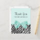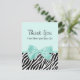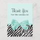 Eine schicke Aquamarine-Mädchen-Babydusche bedankt sich bei einer Postkarte mit einem trendigen Zebradruck und einem gürtelfrischen Minzband, das in einen niedlichen Bogen gebunden ist. Personalisieren Sie diese weibliche Mädchen-Dusche Mädchen drucken danke Ihnen Karte, indem Sie eine besondere Botschaft des Dankes an die Rückseite. Flachbild, nicht echtes Band.