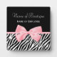 Dekorieren Sie Ihre Boutique-Schaufenster mit dieser schicken und stilvollen Zebra-Printplakette mit einem weichen, gürtelrosafarbenen Band, das in einem niedlichen Bogen befestigt ist. Personalisieren Sie dieses trendige Boutique-Büroaccessoire für Schwarz-Weiß-Schriftzüge, indem Sie den Namen des Verkäufers und des Unternehmens hinzufügen. Flachbild, nicht echtes Band.
