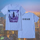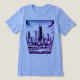 Grafischer T - Shirt mit der Skyline von Chicago Illinois. Schwarz und lila. Die Vorderseite des Shirts ist die Skyline von Chicago. Die Rückseite hat "CHICAGO" in schwarz. Mit der Vorlage können Sie den Text auf der Rückseite ändern oder wie verlassen werden. Großartiger T - Shirt für Männer, Frauen und Kinder.