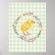 Destei's watercolor illustration featuring a yellow baby chick nestled inside a willow wreath. The wreath is decorated with colorful pastel Easter eggs. The background is a green gingham pattern.