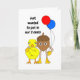 A cute yellow chick and an acorn nut holding ballons is a funny design for birthdays. Text May be Change.
