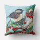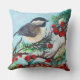 Schwarz gekappte Chickadee mit Berries auf Zweigkissen. Das Design auf diesem Kissen ist ein bezauberndes Winterkichergemälde. Ideal für Natur- und Vogelliebhaber! Dieses Kunstwerk ist auch auf anderen Produkten zum Mischen und Abgleichen von Jenn's Emporium erhältlich.