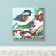 Schwarz gekappte Chickade mit Berries auf Zweigkanälen. Das Design auf dieser Leinwand ist ein bezauberndes Winterkichergemälde. Ideal für Natur- und Vogelliebhaber! Dieses Kunstwerk ist auch auf anderen Produkten zum Mischen und Abgleichen von JennsEmporium erhältlich.
