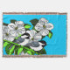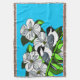 Schwarz gekappte Chickade und Dogwood Blume mit schwarzer Kontur auf hellblauem Hintergrund