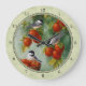 Vögel im Apfelgarten während der Herbsternte. Zwei schwarz gekappte Kichererbsen stehen in einem Apfelbaum, während ein drittes Kichergewächse auf einem Korb sitzt, der mit reifen, frisch geernteten, marktreifen Früchten gefüllt ist. Alles auf einem fröhlich grünen gemusterten Hintergrund. Realistische Kunstwerke, die aus einer Ölmalerei des Künstlers Crista S. Forest entstanden sind.