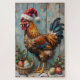 This whimsical folk-art painting on barn wood features a plump, speckled Chicken, wearing a tiny patchwork Santa hat, proudly standing guard over a basket of painted Christmas eggs. A charming and rustic holiday design.