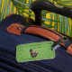 This is a picture of a Chicken on a Luggage Tag that says DON'T TOUCH MY CLUCKIN STUFF.