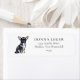 Niedliche, glückliche, lächelnde Chihuahua Hundeillustrierung. Bereit, Ihren personalisierten Namen und Ihre Adresse mit einem modernen Schriftart hinzuzufügen. Einfaches und Minimalistisches Design. Schwarzer Chihuahua.