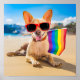 Dieses niedliche Foto verfügt über einen Chihuahua-Hund am Strand, der eine Gay Pride-Fahne in Regenbogenfarbe trägt.
