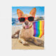 Dieses niedliche Foto verfügt über einen Chihuahua-Hund am Strand, der eine Gay Pride-Fahne mit Regenbogen trägt.