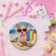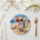 Dieses niedliche Foto verfügt über einen Chihuahua-Hund am Strand, der eine Gay Pride-Fahne mit Regenbogen trägt.