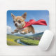 A mousepad featuring a superhero Chihuahua wearing a red cape flying over a pretty scene.