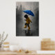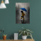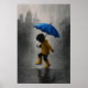 A child in a yellow raincoat and boots holds a bright blue umbrella, joyfully stepping through puddles in a rainy cityscape. The silhouette contrasts against the muted background, conveying a sense of innocence and fun.