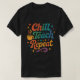 Dieses Design hat einen schwarzen T - Shirt mit dem Wort "Chill" oben in einem stilisierten orangen Schriftart. Unter "Chill" steht das Wort "Teach" in einem stilisierten aquamarinen Schriftart. Unter "Teach" ist das Wort "Repeat" in einem stilisierten orangefarbenen Schriftart. Das Design umfasst auch eine Grafik einer dampfgelben Tasse und verschiedenen bunten Sternexplosionen und Wirbel.