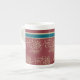 Eine elegante China Coffee Tasse, mit einem formalisierten Blumenmuster und Liegestuhlstreifen in Beige und Dunkelblau auf einem weinroten Hintergrund.