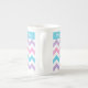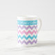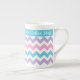 Eine stilvolle China Kaffee-Tasse, die Sie persönlich gestalten können, mit einem Muster aus türkisfarbenem Blau, Candy Pink, Lila und weißen Chevronen. Wenn Sie die Tasse ohne Text bevorzugen, können Sie sie leicht anpassen, indem Sie den Text löschen und das Zickzack Muster nach oben verschieben, bis das schlichte türkisfarbene Band verschwindet.