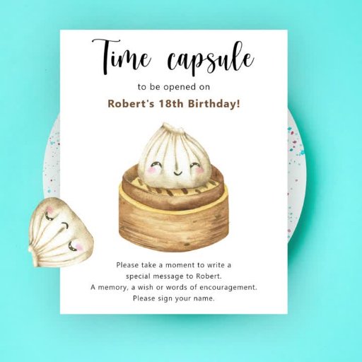 Einladungskarte mit Aquarellbild des Kawaii-Chinesisch-Knödel auf Holzplatte. Im Text steht "UNSER KLEINES DUMPLING".