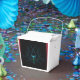 Ein chinesischer Abholkasten mit abstraktem Kunstdesign in den Farben Blau, Grün, Rot und Schwarz. Art von Angela Rohrig