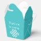 Geben Sie Ihren Gästen, Brautmädchen, Trauzeugen oder jedem anderen eine besondere Leckerei mit diesen individuell anpassbaren Gefälligkeitsboxen mit einem hellen, türkisfarbenen Hintergrund und einem weißen chinesischen viel Glück-Knoten auf der Vorder- und Rückseite der Schachtel. Auf beiden Seiten finden Sie auch Beispieltexte, die Sie für Ihre Hochzeit oder Veranstaltung selbst anpassen können. Verpassen Sie nicht, die anderen Produkte im Chinesischen Stil im Türkisfarben-Set auszuprobieren, um einen wirklich koordinierten Look für Ihre Veranstaltung zu schaffen.