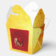 Einfache goldene Tiger-Papier geschnitten in einen verzierten Kreis mit chinesischer Laterne und Fu-Ideogramm (was Luck bedeutet), Blüten und Chinesen grüßen in kleinen Kreisen unter dem Tiger + "Jahr des Tiger" in Handschrift Stil + Fu-Ideogramme als Hintergrund. Design on Take-out Gunst Box für Chinesisches Neujahr des Tiger 2022.
