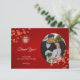 Diese elegante Chinesische Hochzeitskarte mit wunderschönen roten Kirschblüten, einem goldenen Doppelglückssymbol und einem kreisförmigen Foto.