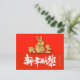 Große Wünsche "Happy New Year" in Chinesisch (weiß moderne Kalligraphie) und in Englisch, Rabbit golden Papier-Schnitt (Bild gedruckt). Design auf horizontaler Postkarte mit rotem Hintergrund + goldfarbenes Texturpapier (Bild gedruckt) innen. Sie können die Hintergrundfarbe leicht ändern, indem Sie auf die Schaltfläche Anpassen klicken. Passende Grußkarte, Aufkleber und mehr... Erhältlich mit anderen Rabbit Papierschnitten. Ideal für Chinesisches Kaninchen im neuen Jahr 2023.