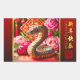 Chinesische Schlange in Papierschnitt-out und Origami-Stil umgeben von Blume von Bündinnen in Papier + Grafik "HAPPY NEW YEAR" in Chinesisch und Englisch und alte chinesische Kalligraphie für "Schlange" auf der rechten Seite auf gradiant roten Band. Design auf einem horizontalen rechteckigen Aufkleber. Ideal für Chinesisch Neujahr der Schlange 2025 oder Geburtstag (Menschen geboren in Schlange Jahr).