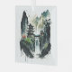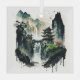 Ein schönes quadratisches Ornament, das eine farbige Abbildung einer Landschaft mit antiker chinesischer Architektur und majestätischen Wasserfällen zeigt.