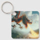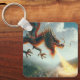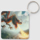 Ein Drache im chinesischen Stil, der vom Himmel abtaucht, atmet Feuer auf ein kleines Dorf. Durch Martinspixs.