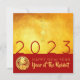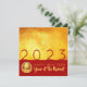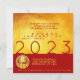 Modernes Design mit goldenem Texturpapier (gedrucktes Bild) mit großen 2023 in rot + kleine runde Tiger Papier-Schnitt mit gelben Texten HAPPY NEW YEAR und Jahr des Rabbits auf einem roten Hintergrund vorne + Texte für Chinesische Neujahrsfeier, um in der Rückseite mit dem gleichen Hintergrund anpassen. Design auf quadratischer Einladungskarte. Matching Grußkarte, Urlaub Postkarte und mehr... Ideal für ein zeitloses und modernes chinesisches Neujahr des Kaninchens 2023.