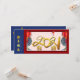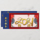 Chinesisches Muster in blau auf beiden Seiten mit roten Laternen, blassrosa chinesische Ideogramme als Hintergrund, große golden 2021 + zwei kleine Ox golden Papier-Schnitt (Bild gedruckt) + Wünsche in Chinesisch und Englisch. Design auf rechteckige, flache Karte mit großem Ochse und einer anderen Nachricht mit Familienname, um die Rückseite der Karte anzupassen. Passende Grußkarte, Postkarte und andere Flachkarten.