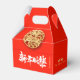 Große Wünsche "Happy New Year" in Chinesisch (weiß moderne Kalligrafie) und in Englisch, Tiger rund golden Papier-Schnitt (Bild gedruckt - Modell n°1). Design auf Gable Gevor-Box mit rotem Hintergrund + Familienname und Nachricht zum Anpassen. Sie können Text (Schriftart, Farbe, Größe und Position) und Hintergrundfarbe leicht ändern, indem Sie auf die Schaltfläche Anpassen klicken. Erhältlich in anderen Formen: Zelt-, Würfel- und Abholboxen sowie mit anderen Tigerpapier-Schnitten.