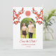 Rote Kirschblüten und ein rotes doppeltes Glückssymbol auf weißem Hintergrund. Save the Date Text in einem eleganten Schriftart. Passen Sie es mit Ihrem Foto an. Es stehen passende chinesische Hochzeitsprodukte zur Verfügung.