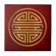 Diese Keramik-Kachel ist ein chinesischer Shou-Charakter, der Langlebigkeit darstellt. Das Symbol ist in Gold auf einem texturierten roten Hintergrund gefärbt.