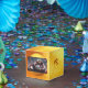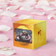 Chinesische Schlange in eine Landschaft chinesischer traditioneller Häuser und Gärten (Modell Nr. 2) mit goldenem Hintergrund und kleinen Grenzen, die Sie entfernen können, wie das "Holz"-Bild, das dem Element entspricht, das mit der Schlange von 2025 verbunden ist. Design auf würfelförmigen Gefälligkeitsbox mit kleinen, anpassbaren Texten : Begrüßung auf Chinesisch + "Happy Chinese New Year" + "Jahr der Schlange" + 2025 + Nachricht zum Anpassen und Familienname.