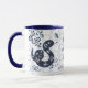 Jahr der Schlange Tasse für ein chinesisches Neujahr! Die handgemalten Schlangenbilder in blau auf weiß werden von alten chinoiserie asiatischen Töpfermotiven inspiriert. Hier sind zwei Schlangen mit Blumenmuster auf einem geometrisch gemusterten Hintergrund geschmückt. Reads, "Jahr der Schlange" und "intelligent weise rätselhaft." 2025 ist das Jahr der Schlange in der chinesischen Zodiaka. Originelles Kunstwerk & Design von Tuzi Williams.