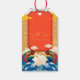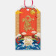 Schönes chinesisches goldenes Drachenpapier geschnitten in ein rotes Panel + goldenes Fu Ideogramm mit anderen Drachen und chinesisches Dekorationsmuster + goldenes "Jahr des Drachen" + Wünsche in Chinesisch + golden 2024. Design auf dem Geschenktag mit Nachricht und Familienname, um zu personalisieren. Passende Grußkarte, Postkarte und Aufkleber. Perfekt für das chinesische Neujahr des Drachen 2024.