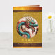 Chinesischer Drache in einem goldenen Rahmen mit einem Hintergrund aus mehreren Schichten, die Sie entfernen können, wie das "Holz" Bild, das entspricht dem Element, das mit dem Drachen von 2024 verbunden ist. Design auf vertikale Grußkarte mit kleinen "Happy Chinese New Year" + golden 2024 + goldener Gruß in Chinesisch + golden "Jahr des Drachen". Andere Modelle sind erhältlich.