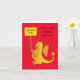 Ein Cartoon eines lächelnden Drachen-Set vor einem leuchtend roten Hintergrund. Der Drache hält ein Schild auf, auf dem steht: "Wünscht euch!". Neben dem Bild sind die Worte "Ein sehr glückliches chinesisches Neujahr".