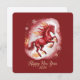 Eine handgemalte Aquarellillustration eines majestätischen roten Feuriga mit fließender karmesinroter Mähne und Schweif, der elegant vor einem warmen burgunderroten Hintergrund tanzt. Das Fell des Pferdes schimmert in tiefen Scharlach- und Kirschrot-Tönen, während goldene Flammen um seine Hufe und durch seine windzerzauste Mähne zu flackern scheinen. Zarte Schneeflocken treiben sanft um die Szene herum und schaffen eine magische Winteratmosphäre mit weichen weißen Lichtern. Unten steht in eleganter Kalligrafie "Happy New Year 2026" in reich vergoldeter Schrift und vervollständigt dieses festliche Weihnachtsgrußkarten-Design mit traditionellem festlichen Charme.