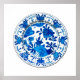 Druck einer antiken chinesischen Porzellanplatte in Kobalt- und Indigoblau mit Weiß, in einer verzierten 8-Wege-Grenze, umgeben von Blume, Blätter und Wolken aus der Pfirsiche - digital verbessert und farblich angepasst